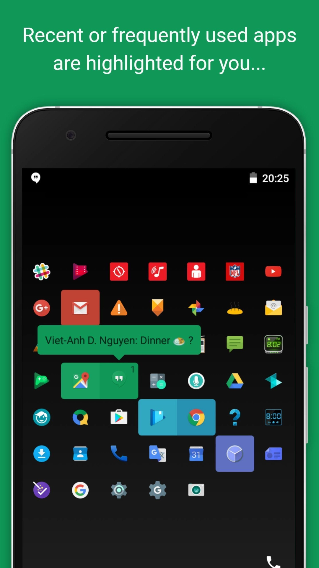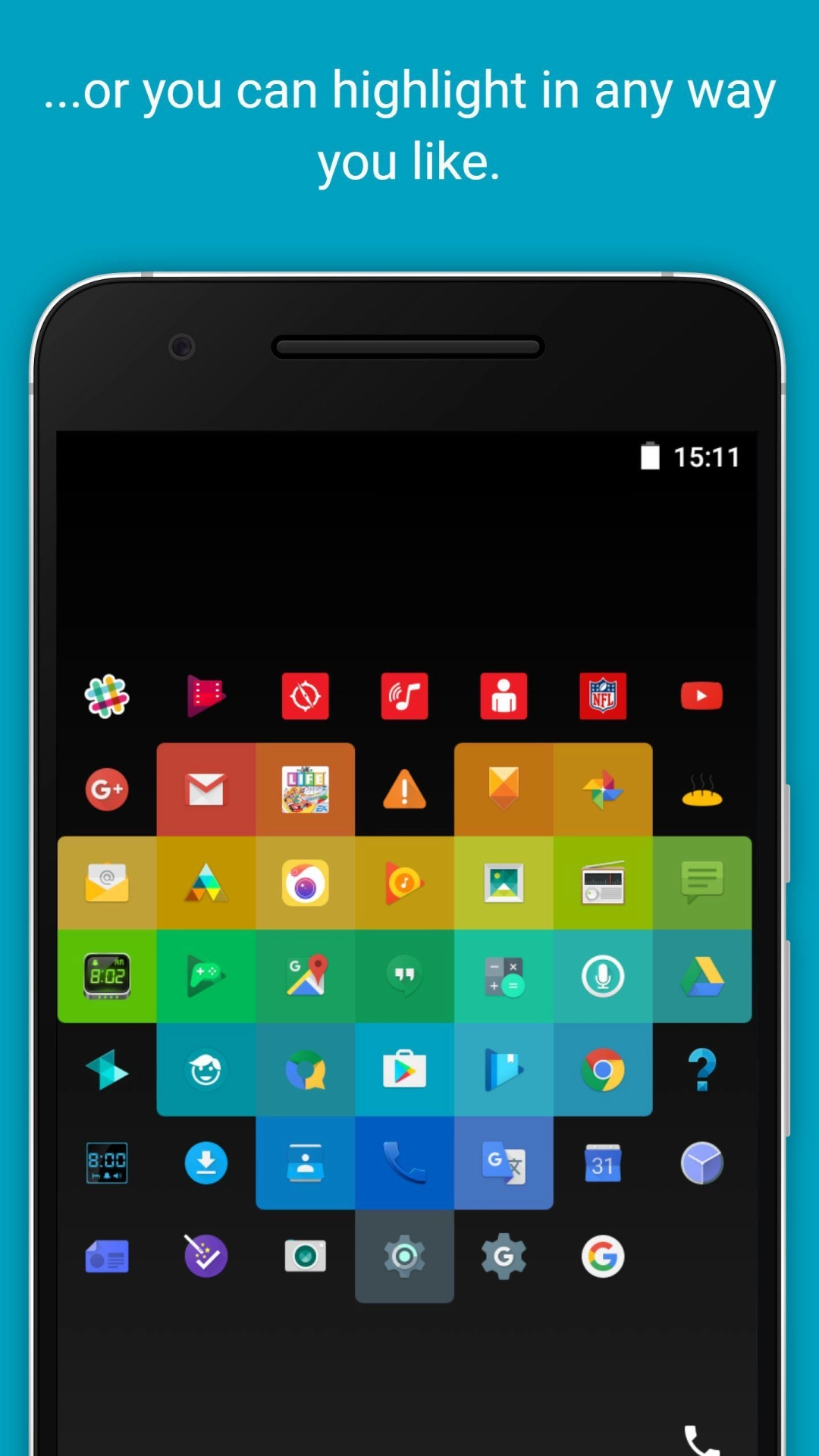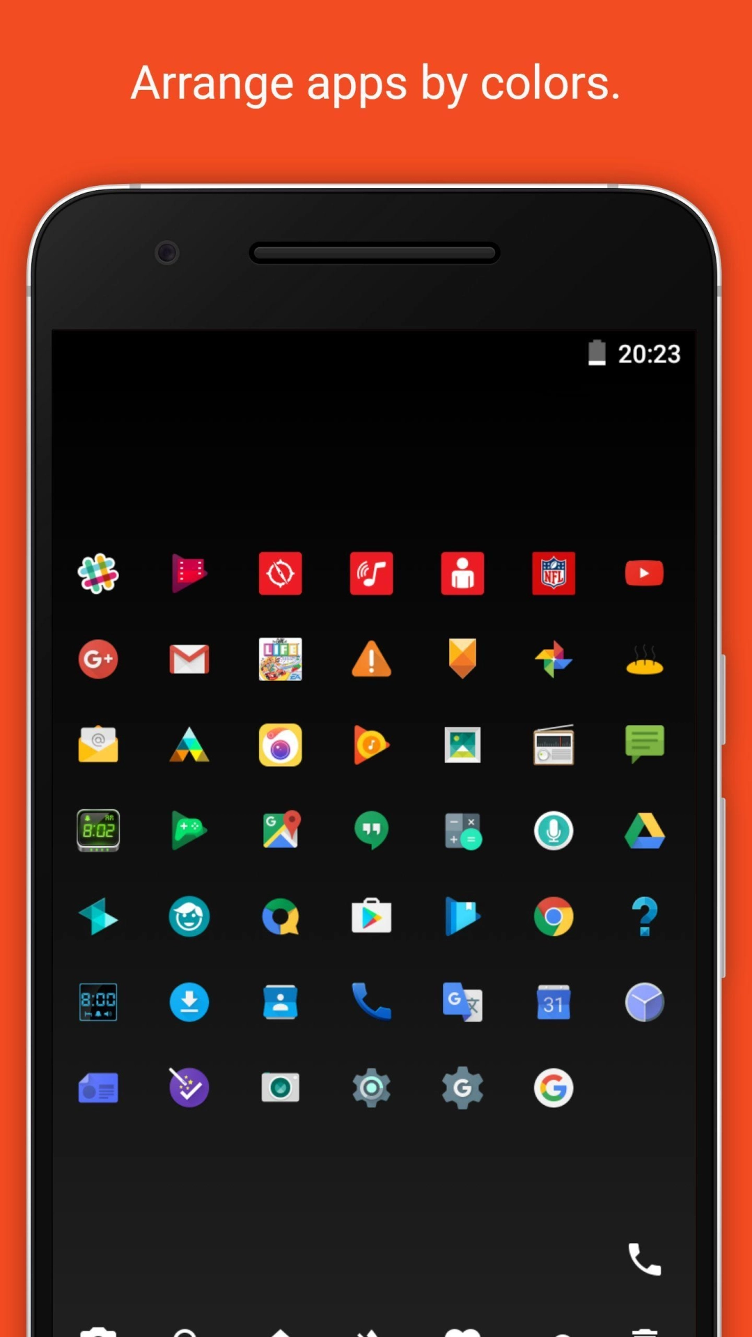 App icons have unique colors and designs, let their uniqueness shine! <br><br>This launcher lets you organize your app icons by color. You can highlight your favorite apps by long-pressing their icons, or over time the launcher will highlight them automa
