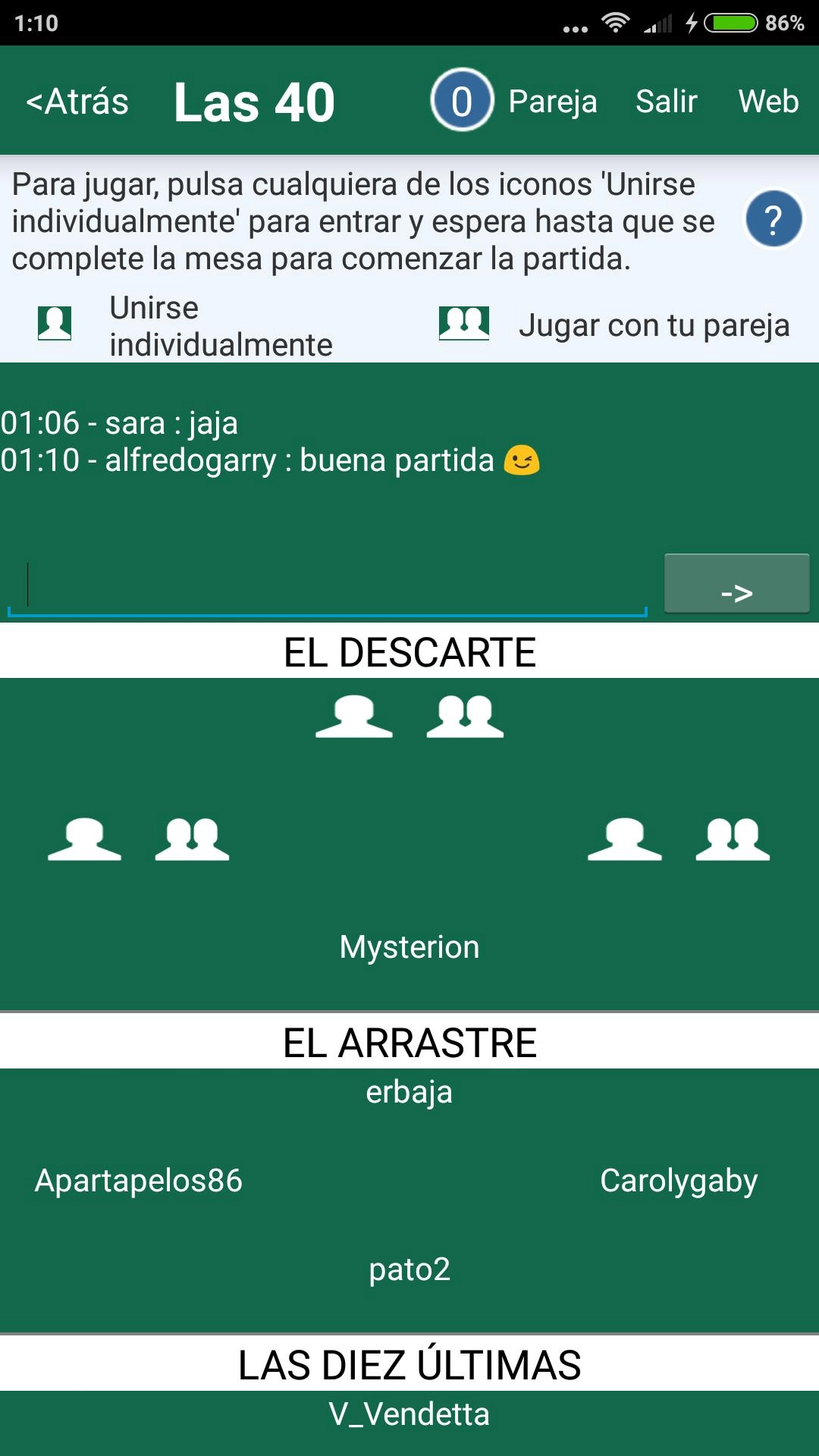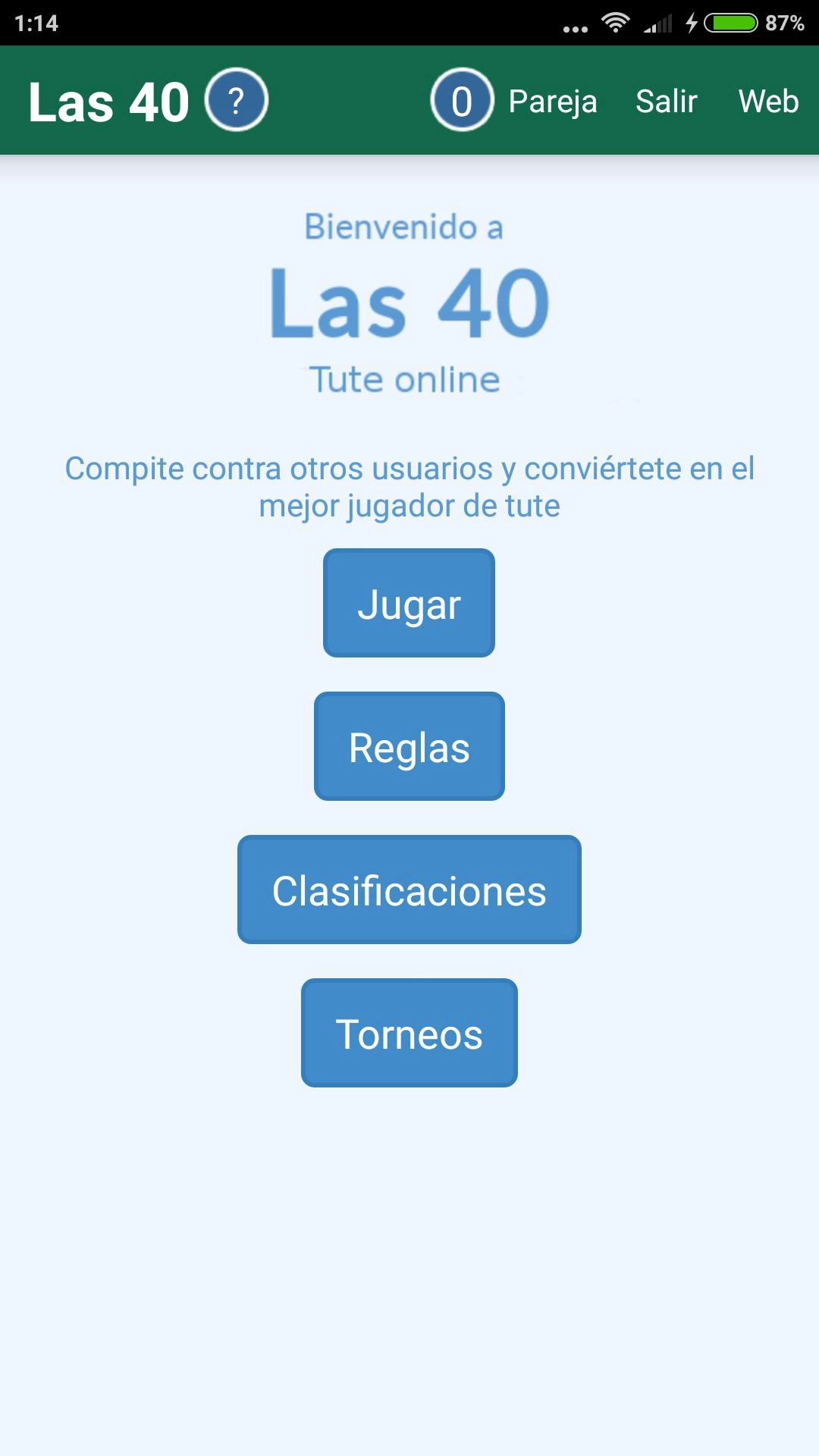 Tute is a web-based application that allows playing http://tute.las40.es tute couples online against other users. The games are played with 3 points after each game and an update of the ranking of couples depending on the result.<br><br>Join free Tute cha