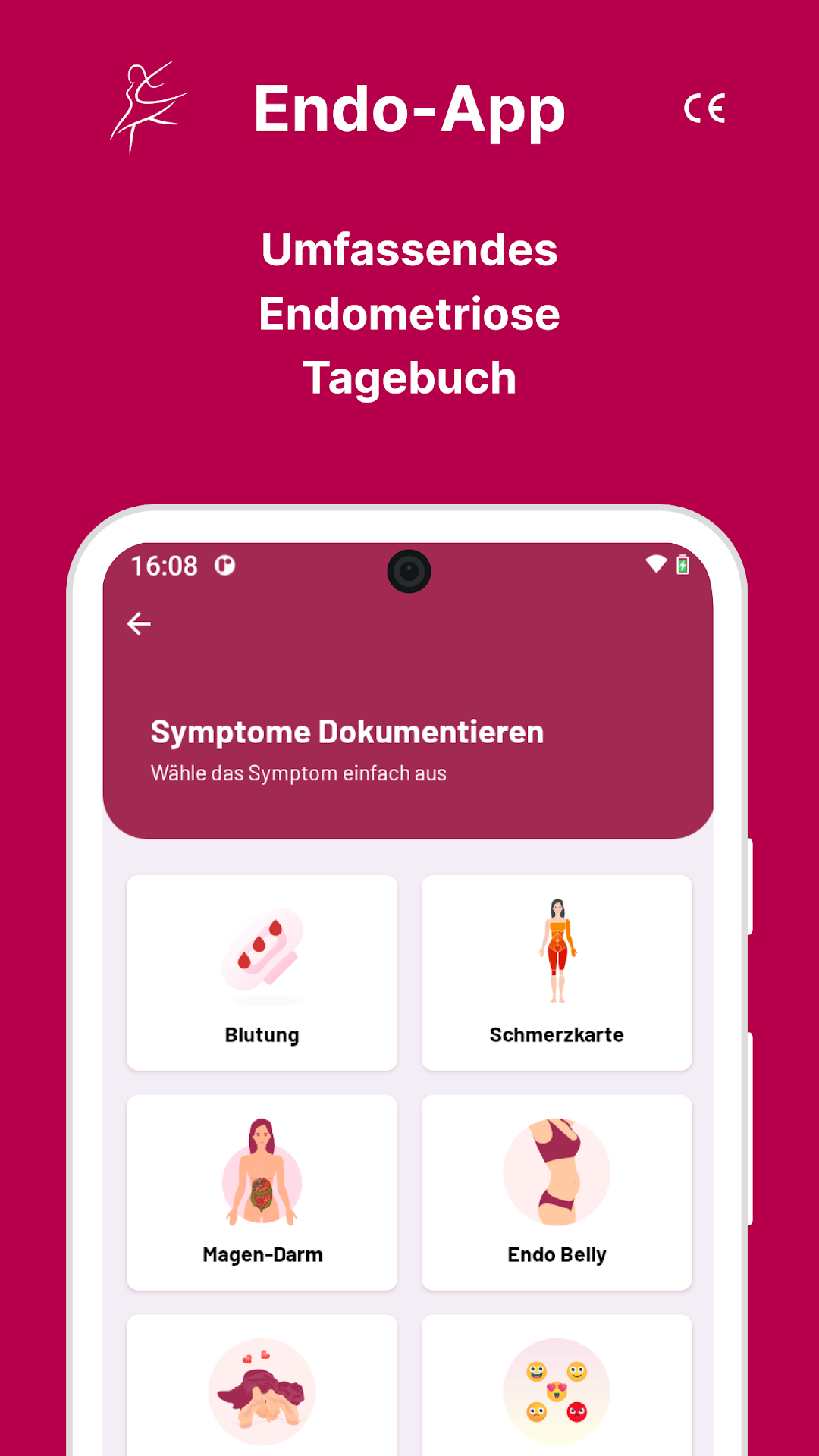 Unabhängig von Pharmafirmen – direkt für das Wohl der Endometriose-Betroffenen entwickelt. Die Endo-App ist ein zertifiziertes Medizinprodukt (CE) und eine zugelassene digitale Gesundheitsanwendung in Deutschland (siehe https://diga.bfarm.de/de/verzeichnis).