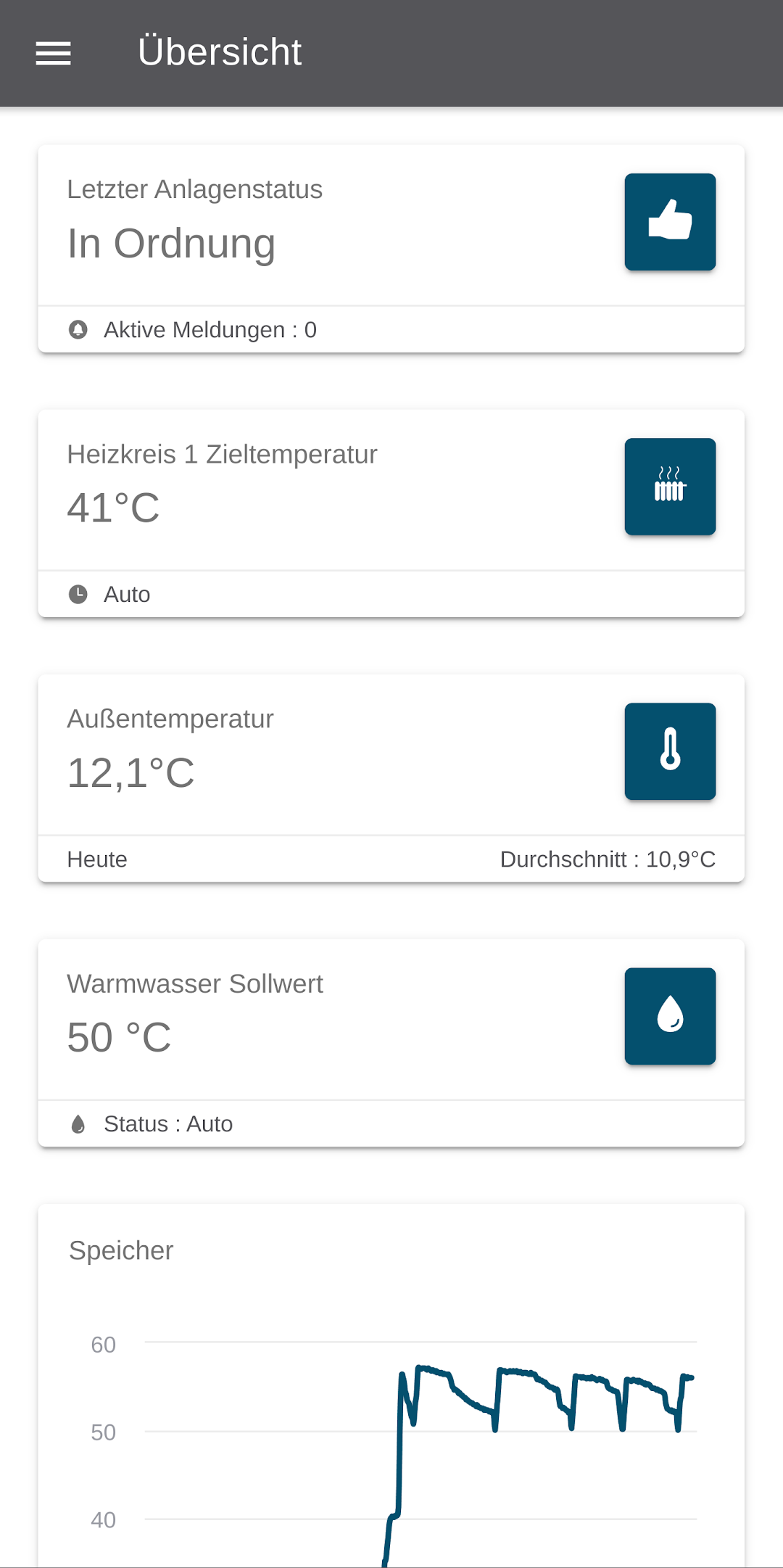 App ist sehr übersichtlich und einfach zu bedienen und viele Einstellungen lassen sich leichter über die App statt über die Anlage eingeben. Vor allem praktisch wenn man nicht zuhause ist. Zeitweise gab es Schwierigkeiten mit dem Zugriff auf die verbrauchsdaten (lag wohl am solvis Server). Das scheint jetzt mit der aktuellen Version behoben zu sein.