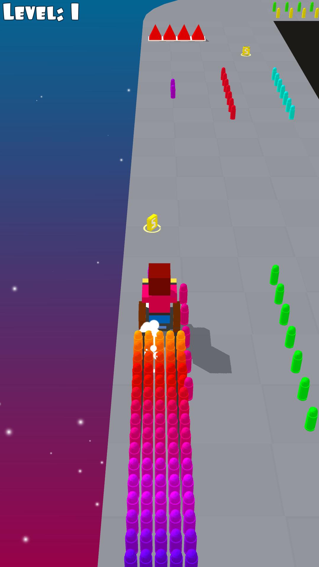 Your character runs automatically along a dynamic zigzag path. Swipe left or right to steer, avoid deadly obstacles, and collect ammo scattered across the route. Each bullet you gather increases your power for the final assault.